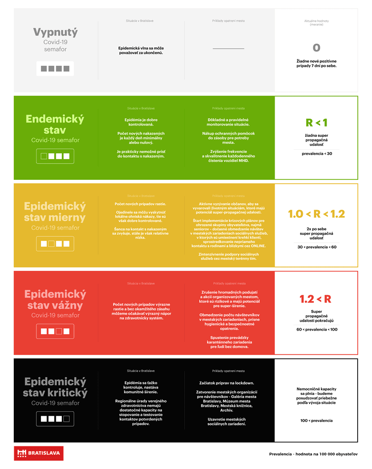 Bratislava pred dvoma týždňami spustila tzv. COVID semafor, ktorý na základe komplexného vyhodnotenia epidemiologických dát umožňuje mestu včas reagovať na zhoršujúcu sa epidemiologickú situáciu. Uvedomujeme si, že prísnejšie protiepidemiologické opatrenia majú dopady na bežné životy obyvateliek a obyvateľov mesta a neberieme ich preto na ľahkú váhu. Práve preto robí mesto rozhodnutia až na základe odborného posúdenia objektívnych dát, aby sme nezavádzali opatrenia, pokiaľ skutočne nie sú potrebné a aby sme zároveň nepremeškali obdobie, keď rast pandémie ešte ovplyvniť vieme. Dáta z posledných dní potvrdili, že epidemiologická situácia sa v Bratislave zhoršila a dva zo sledovaných ukazovateľov sa už dostali do červenej fázy.
