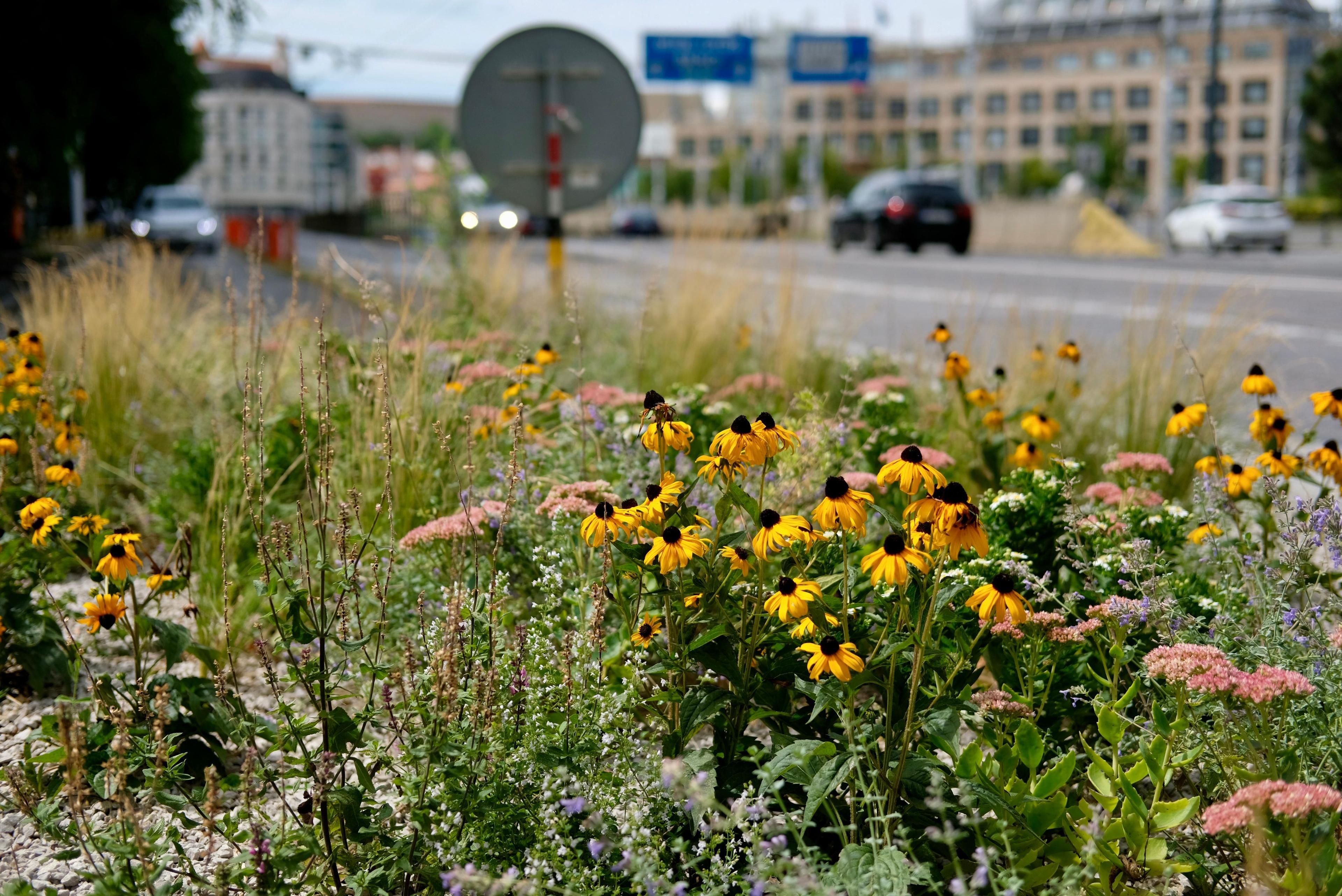 Asfaltové ostrovy v strede ciest a križovatiek mesto premieňa postupne zelené ostrovy. Najprv odstránime asfalt, vytvoríme jamu a naplníme ju substrátom a vysadíme vhodné rastliny, ktoré vedia prežiť suchšie obdobia aj prebytok vlahy.