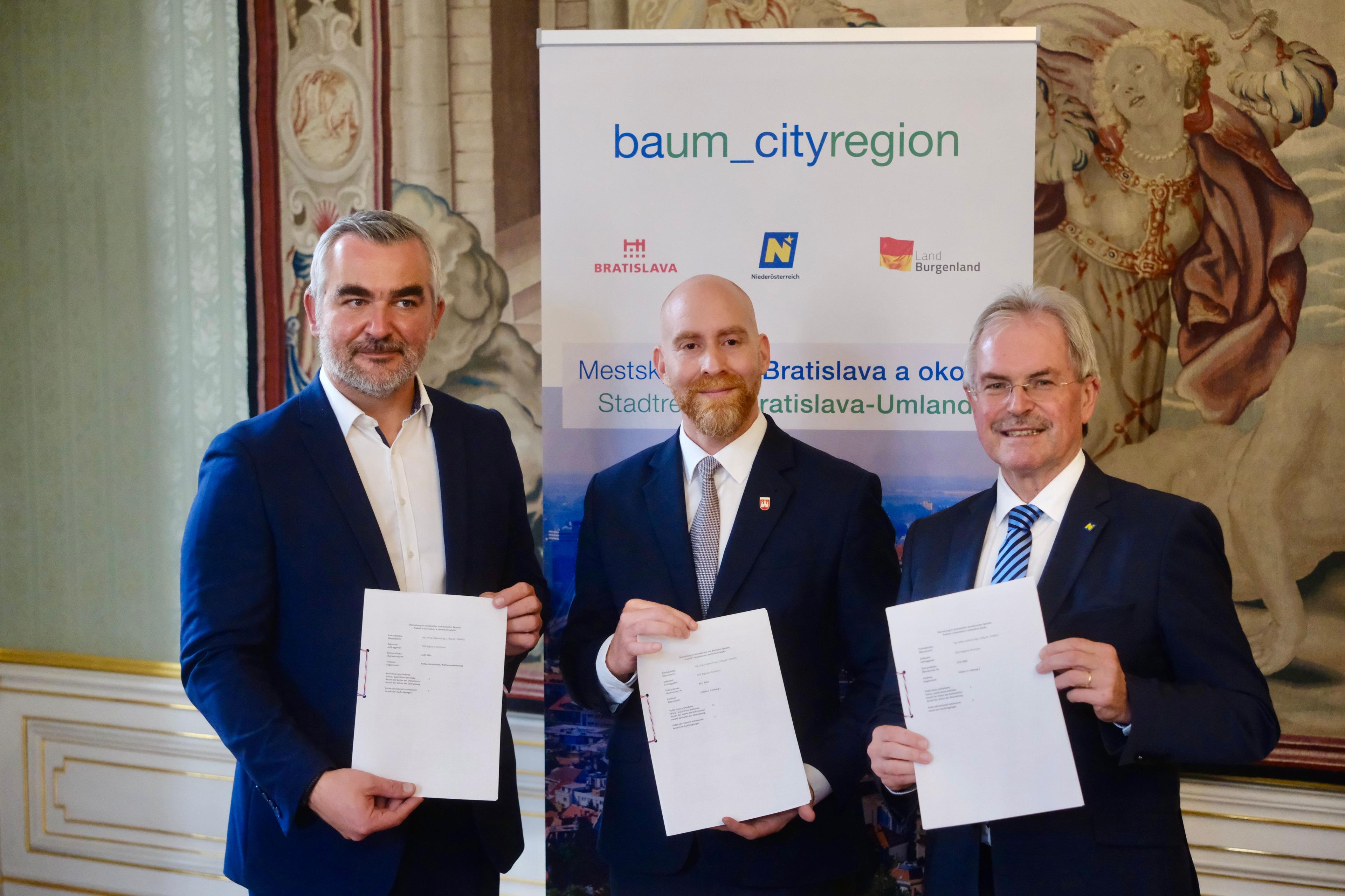 Bratislava, 12. november 2025 – V Primaciálnom paláci v Bratislave sa dnes uskutočnilo historicky prvé zasadnutie politického grémia nového pracovného spoločenstva, zloženého zo zástupcov hlavného mesta Bratislavy, Dolného Rakúska a Burgenlandska. Politické grémium je najvyšším orgánom novovzniknutého pracovného spoločenstva baum_cityregion. Cieľom pracovného spoločenstva je silnejšie prepojenie regiónov, ale tiež lepšia, efektívnejšia spolupráca pri strategických projektoch.